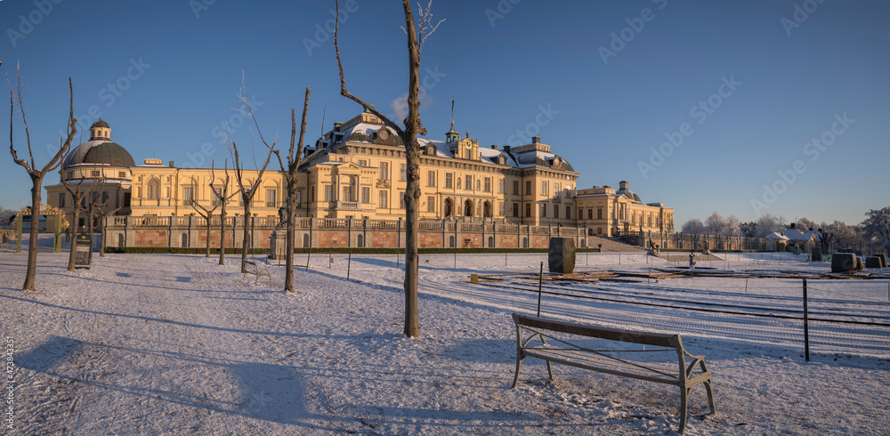Fototapeta Sunny winter view over the Drottningholm palace a pale winter day, snow layer on