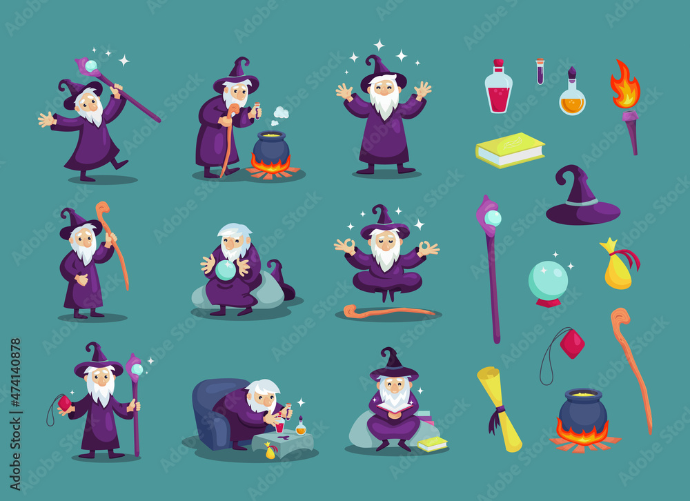 Fototapeta Wizard male character, mage, sorcerer in mantle and hat.