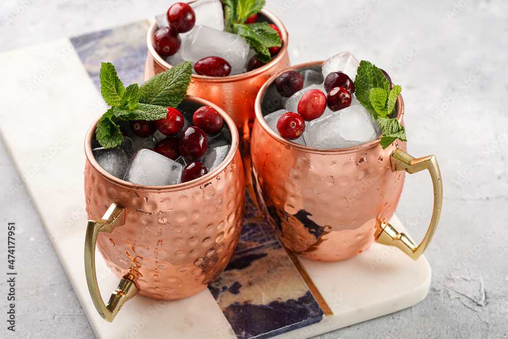 Fototapeta Traditional american alcoholic beverage moscow mule in copper mugs with cranberr