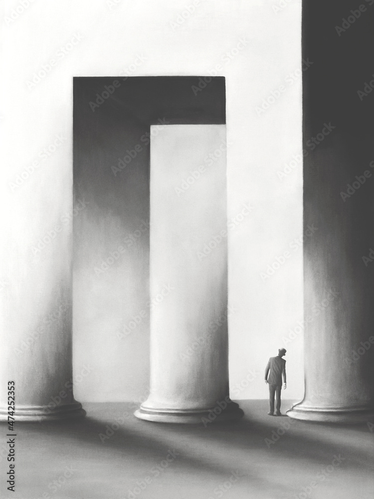 Fototapeta Illustration of man inside a surreal building, optical illusion abstract concept