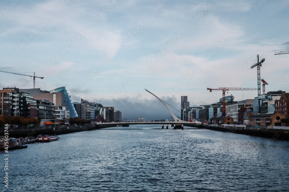 Fototapeta Tranquil urban scenery of a river in an industrial area in Dublin on a gloomy da