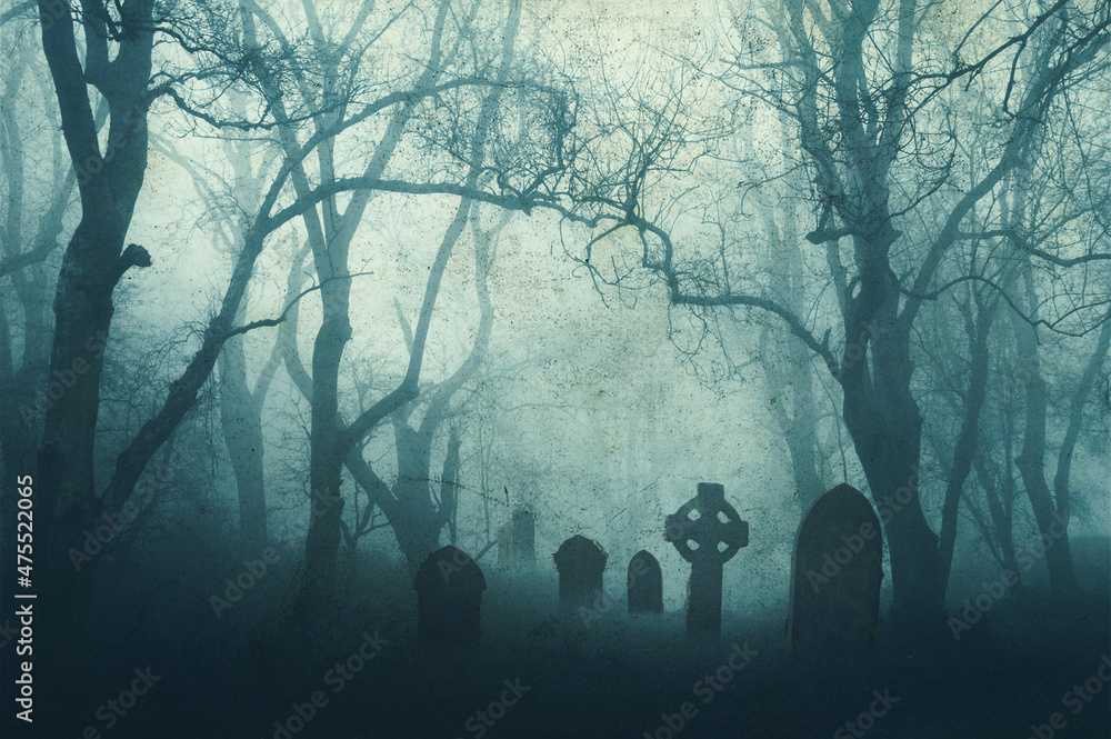 Fototapeta A horror concept of a spooky graveyard in a scary forest in winter, with the trees silhouetted by fog