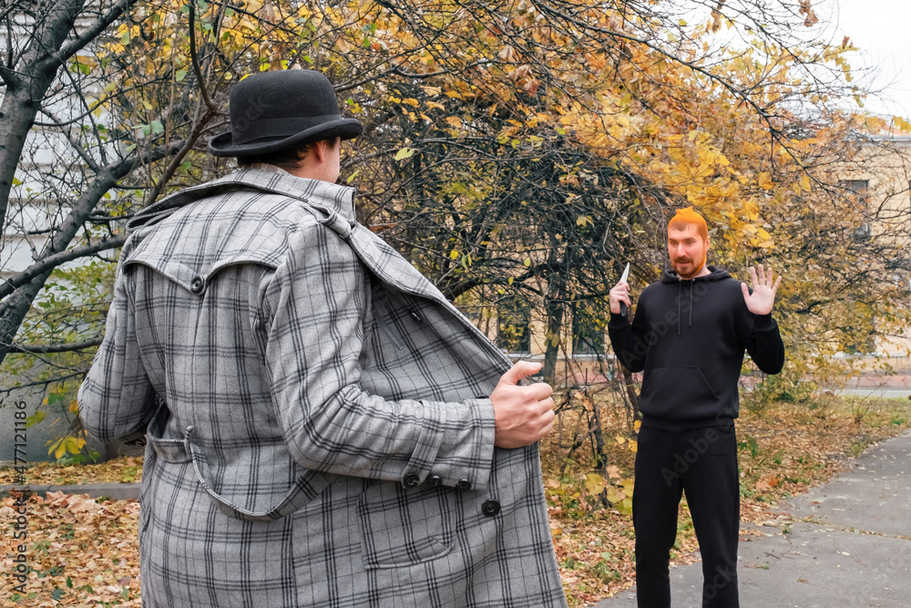 Fototapeta Pervert exhibitionist in the park scares a robber