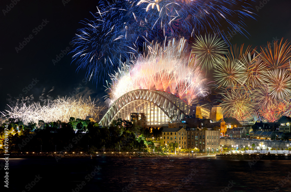 Fototapeta Sydney Harbour Bridge New Years Eve fireworks, colourful fire works lighting the