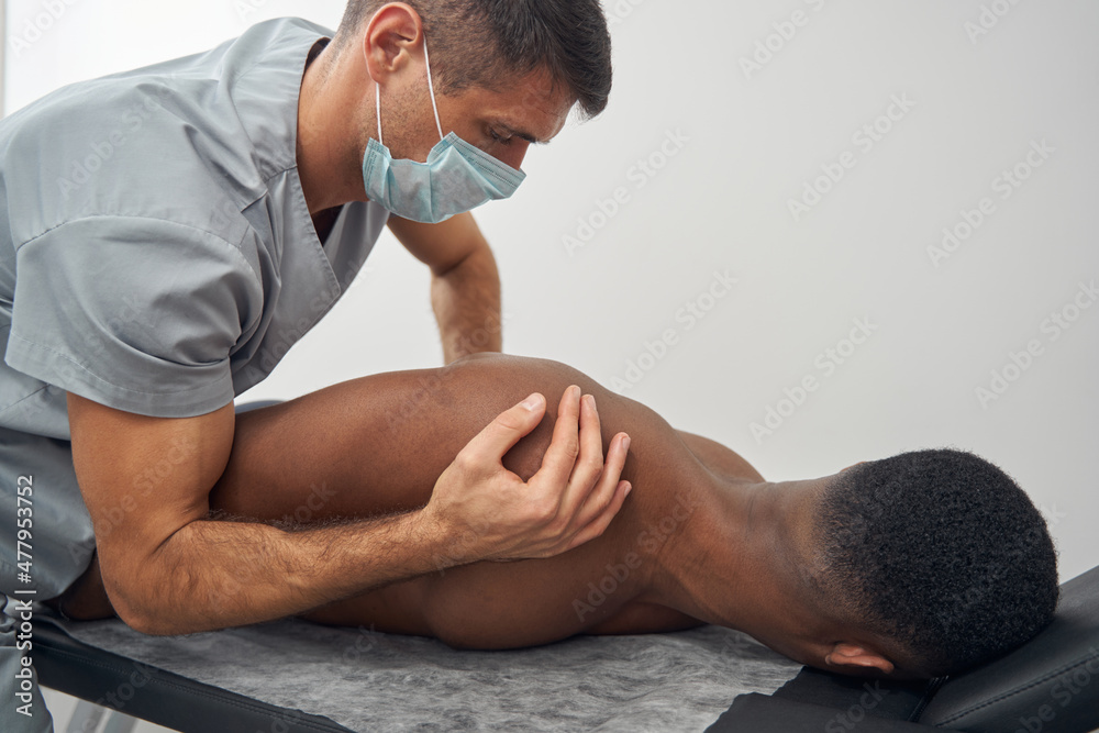 Fototapeta Focused qualified Caucasian doctor performing chiropractic adjustment