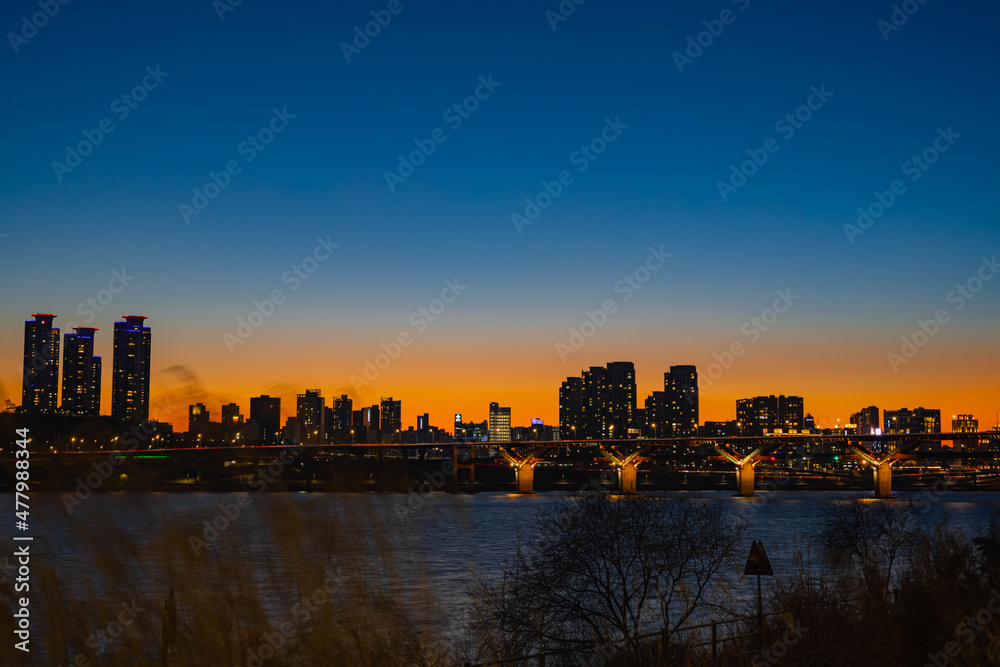Fototapeta 겨울 강의 일몰 후 하늘의 파란색과 붉은색 대비