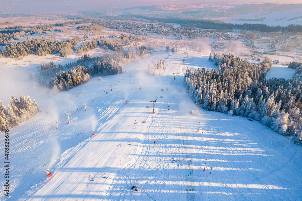 Fototapeta Drone View at Ski SLope in kotelnica, Zakopane, Poland at Cold Sunny Winter Day