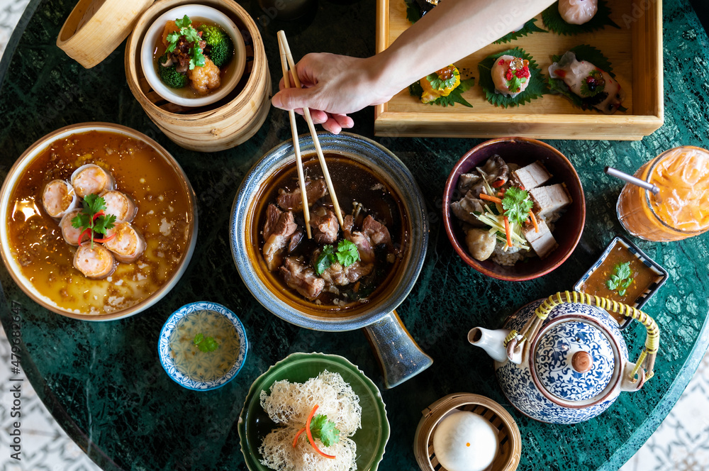 Fototapeta Chinese Yumcha Dimsum Set in bamboo containerr, chinese cuisine , top view