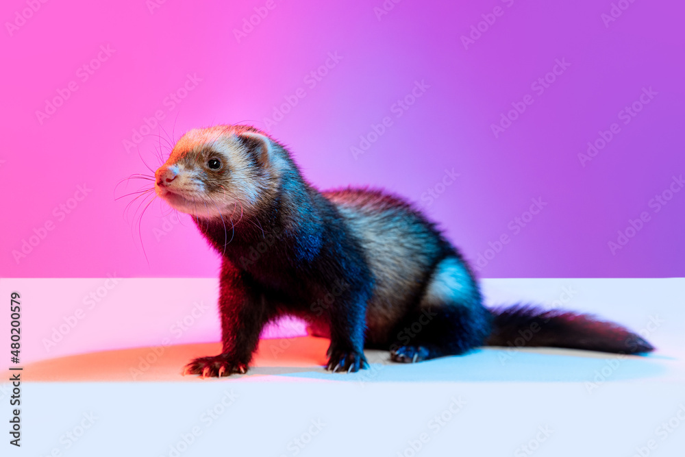 Fototapeta Closeup beautiful little white grey ferret isolated over pink background in neon light