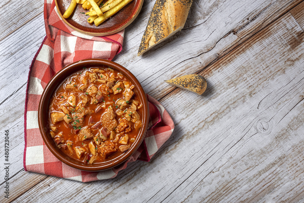 Fototapeta Traditional homemade and typical tripe recipe Madrid style with bread and French