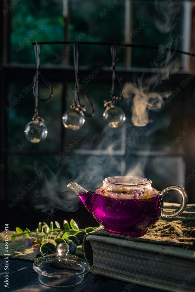 Fototapeta Violet tea still life with window and witchy magic atmosphere