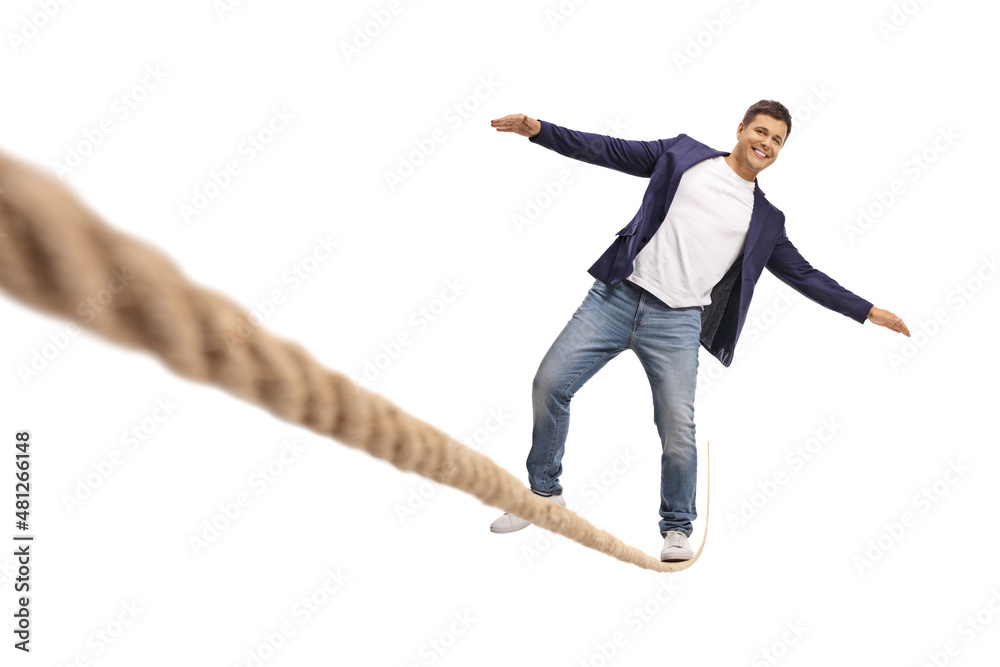 Fototapeta Full length portrait of a smiling young man walking over tightrope