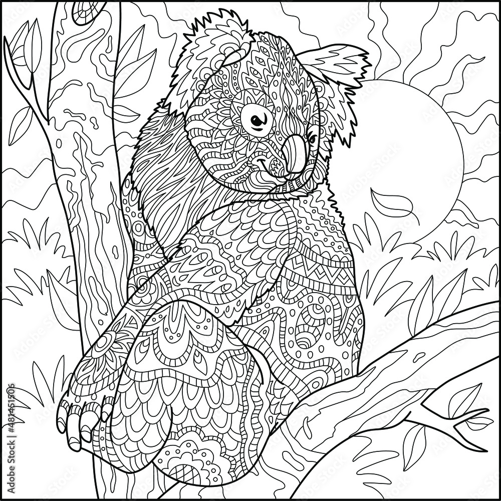Fototapeta stylized cartoon koala bear sits among the leaves of a tree
