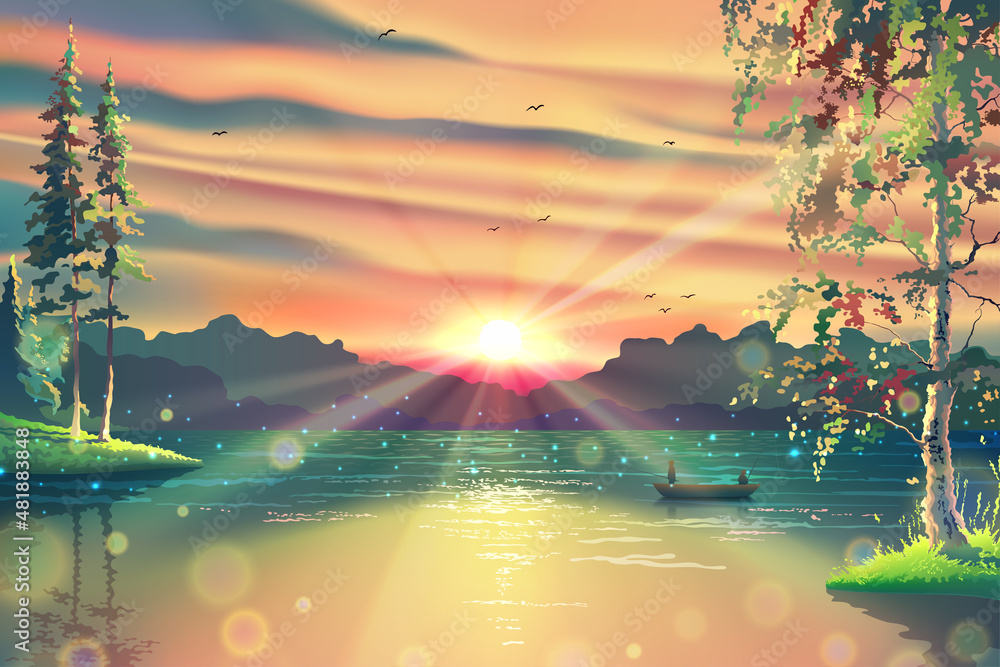 Fototapeta Sunny landscape with park or garden, water reflections, green grass, forest trees as pines and birches, sunlight, summer lake or pond with fisherman on vessel, birds, sun, morning nature artwork