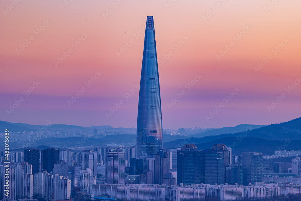 Fototapeta Cityscape night view of Seoul, South Korea at sunset time