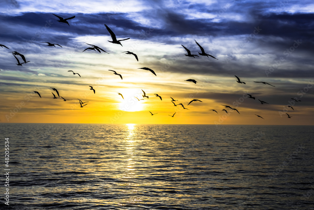 Fototapeta dramatic dark cloudy sunset over the ocean with flying seagulls