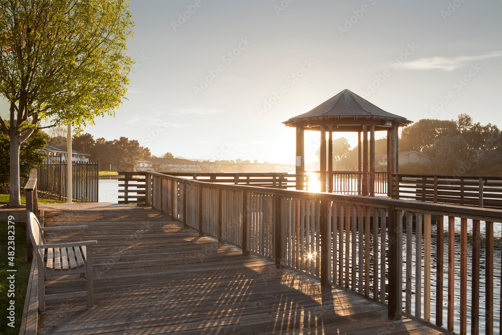 Fototapeta Panoramic view of wooden deck with bench and bower along the river bank