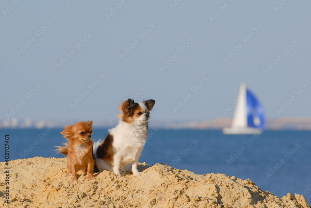 Fototapeta two funny active healthy small dogs chihuahua with wind in their fur standing on
