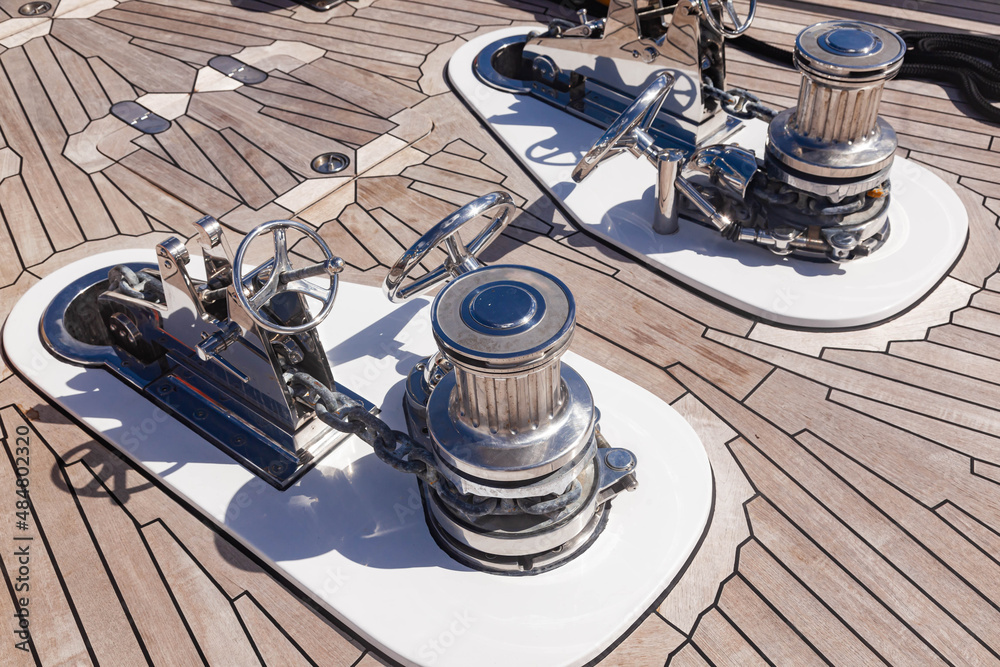 Fototapeta Teak deck of a luxury yacht with stainless steel winches and anchor chain attachment mechanisms