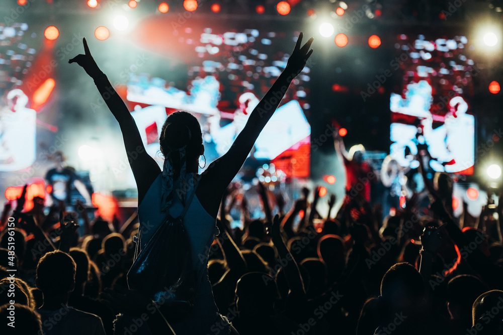 Fototapeta Silhouette of a woman with raised hands on a concert