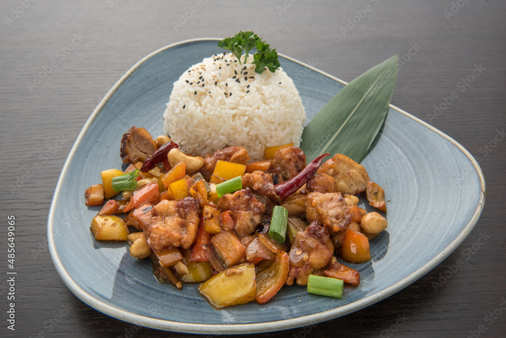 Fototapeta Stir fry chicken cashew nuts, Typical Thai main dish with fried chicken, peppers