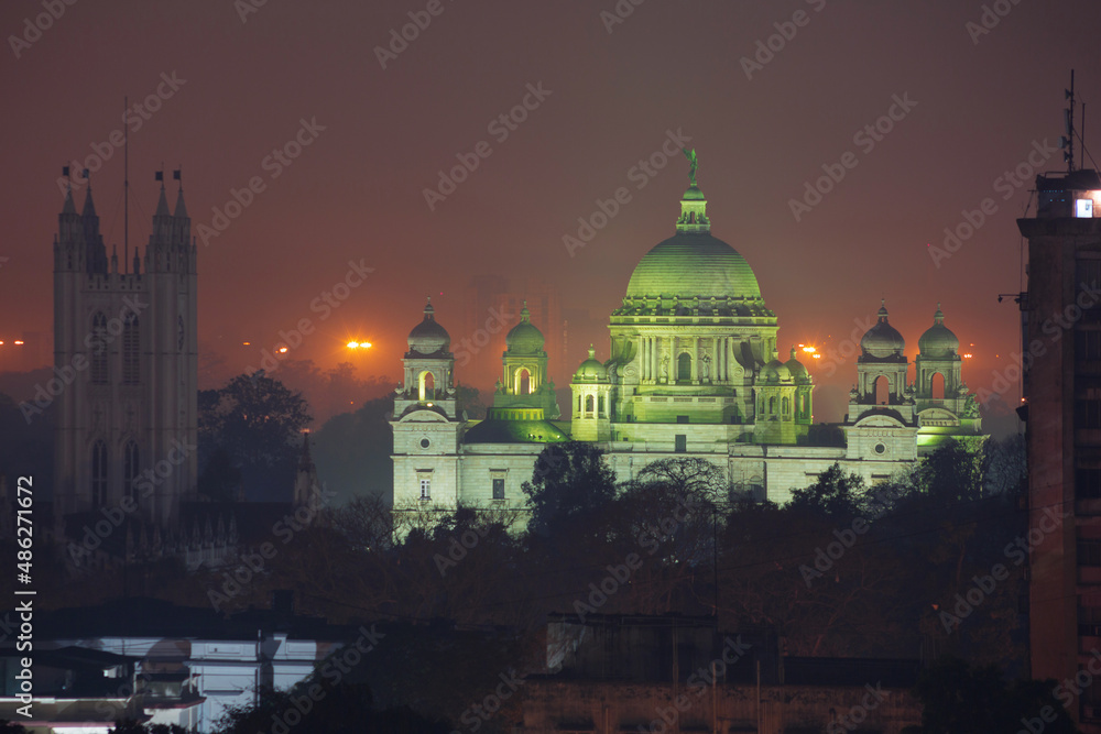 Fototapeta Illuminated memorial of Queen Victoria, in the city of Kolkata at night, close-u