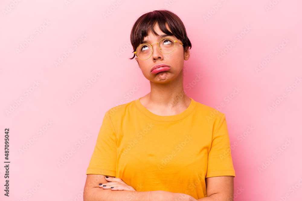 Fototapeta Young hispanic woman isolated on pink background tired of a repetitive task