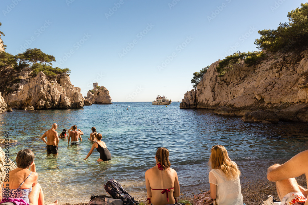 Fototapeta Baignade dans une crique de la méditerranée, la calanque de Sugiton en automne devant un bateau de touristes