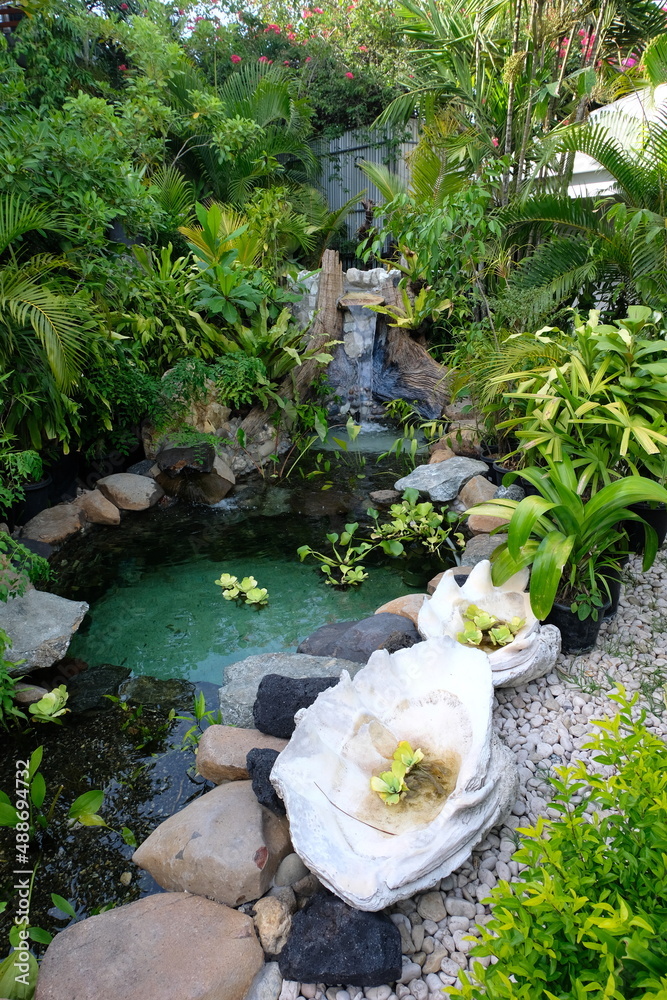 Fototapeta Beautiful landscaped tropical island garden hideaway with densely populated plan
