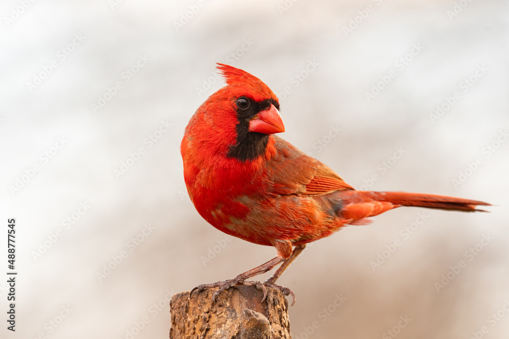 Fototapeta A male Northern Cardinal (Cardinalis cardinalis) perching on a tree with light background