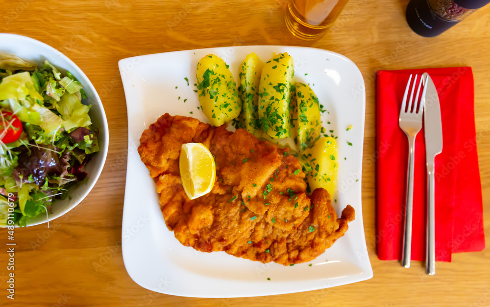 Fototapeta Austrian cuisine, original wiener schnitzel with boiled potatoes and lemon in a