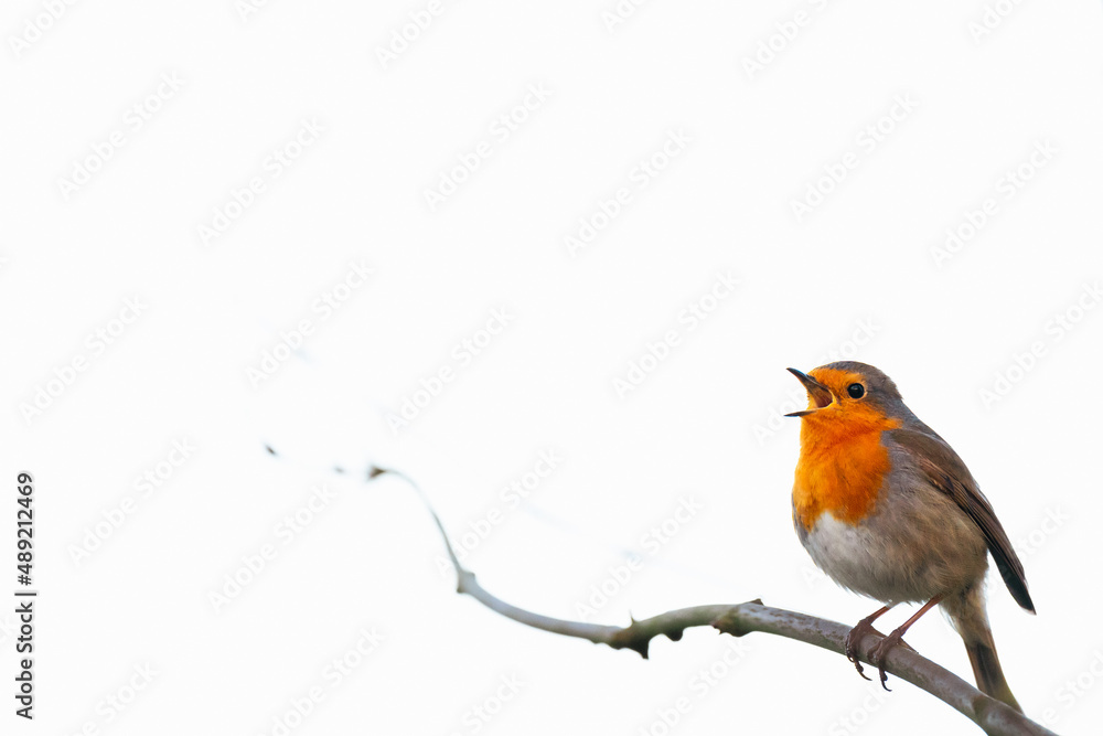 Fototapeta Singing robin, sitting on a branch, light background