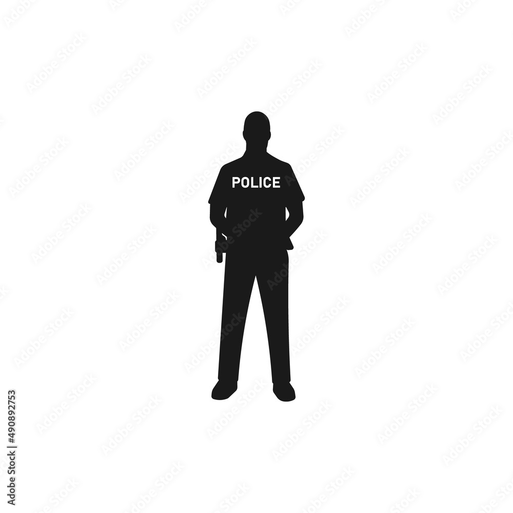 Fototapeta Standing policeman in uniform black vector silhouette or logo illustration