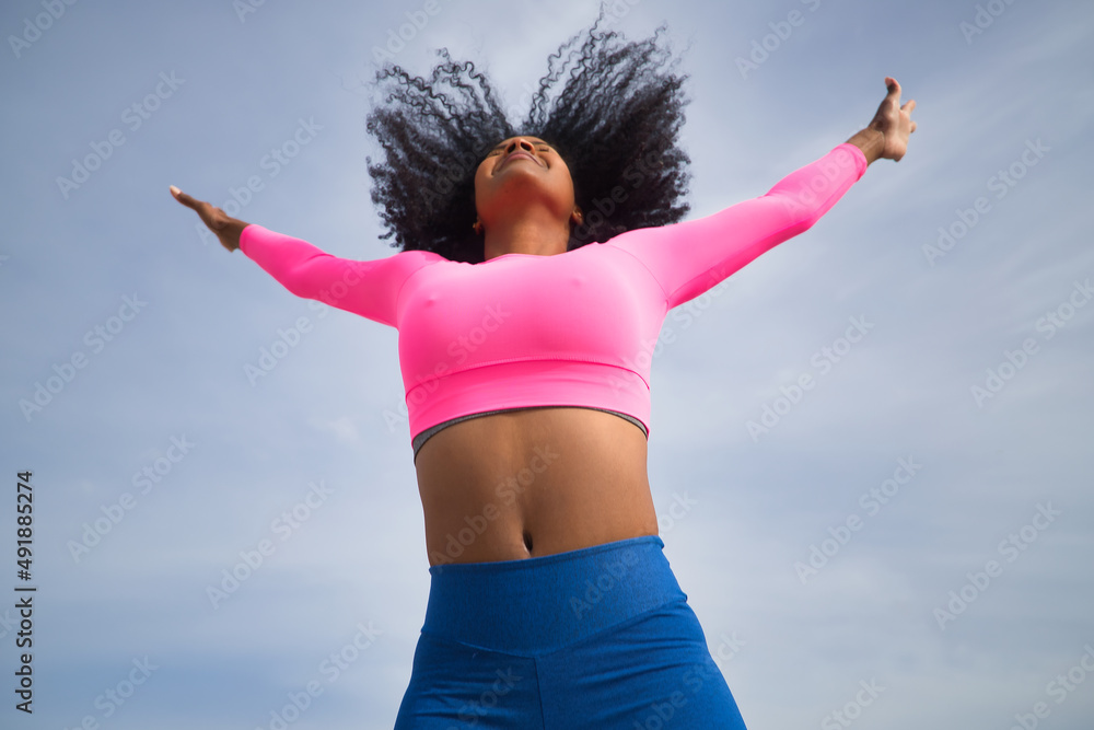 Fototapeta African-American woman with afro hair and sportswear, with fluorescent pink t-shirt and leggings, jumping into the sky, seen from below