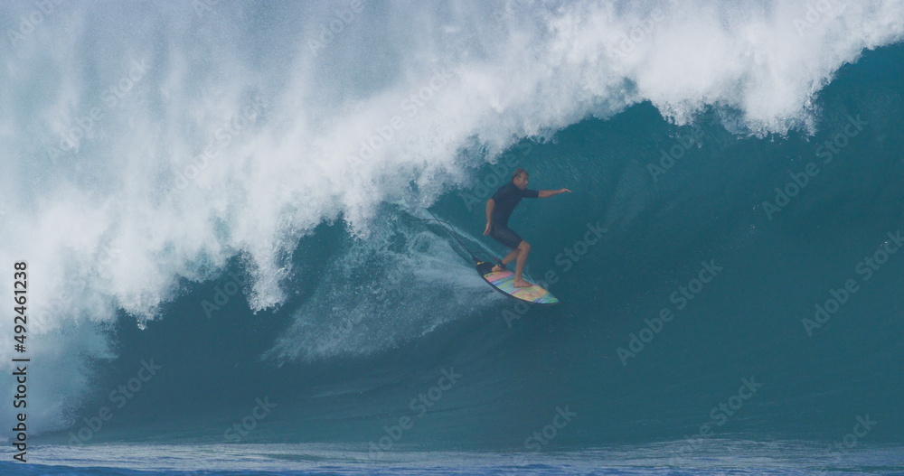 Fototapeta Surfer surfing big ocean barrel tube wave at Pipeline in north shore of Hawaii's