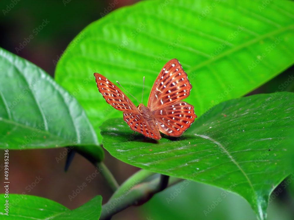 Fototapeta Macro shot of a Punchinello sitting on a green leaf, Tai Po Kau, Hong Kong