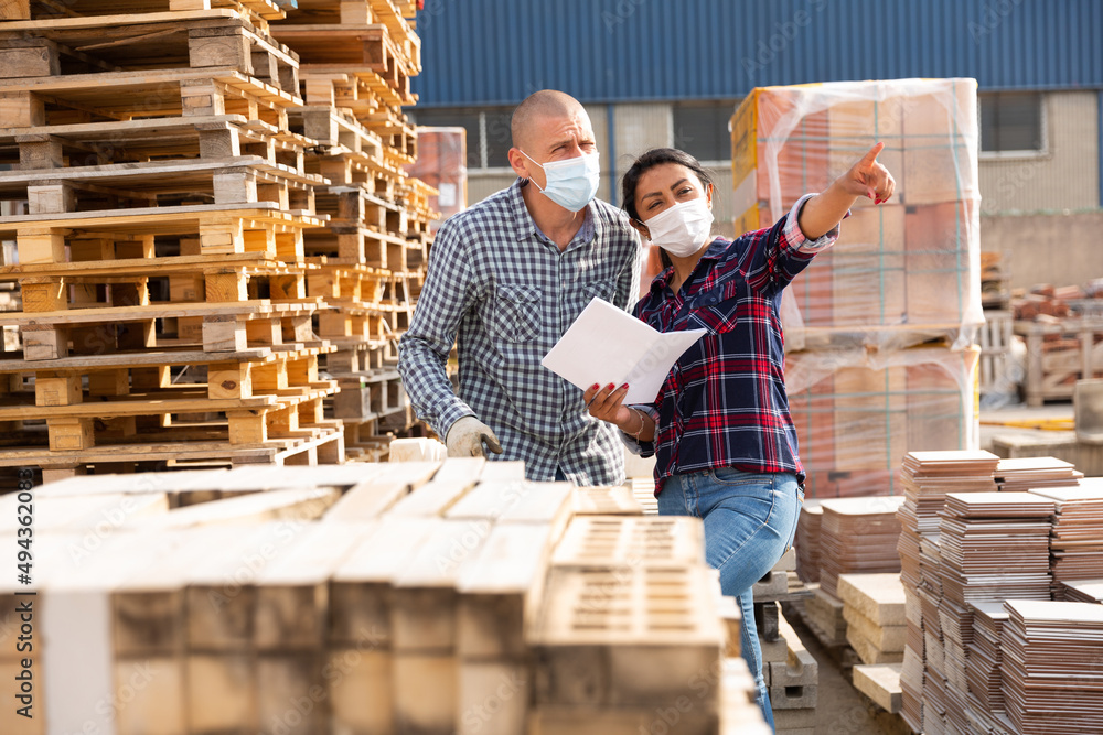 Fototapeta Couple of wokers in protective face masks checking order list at hardware store