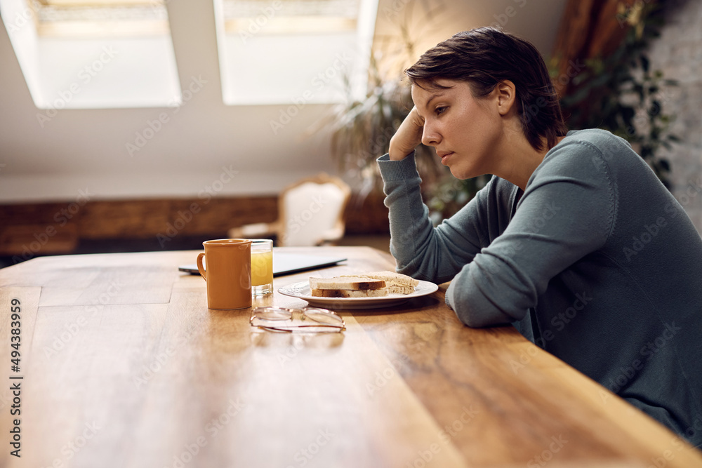Fototapeta Thoughtful woman has no appetite while sitting at dining table at home