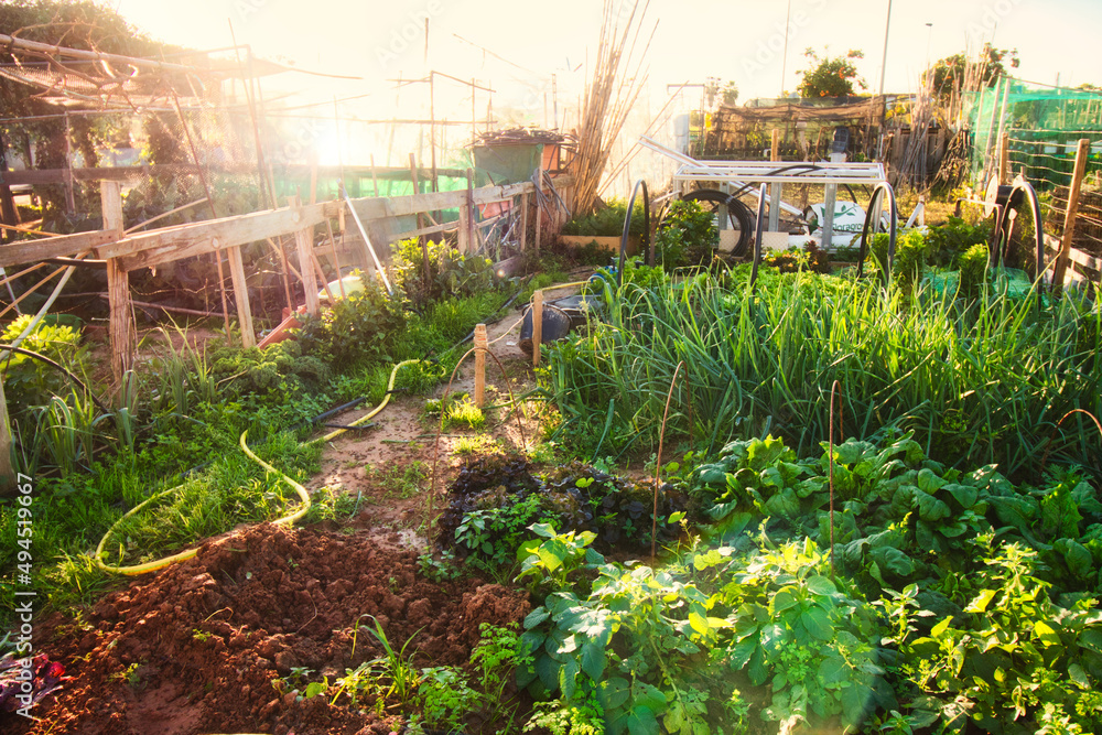 Fototapeta Various vegetables growing on a small allotment plot on a sunny day