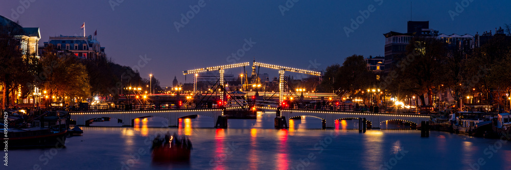 Fototapeta Panoramic view of Magere Brug (English: Skinny Bridge) at night, Amsterdam, the Netherlands