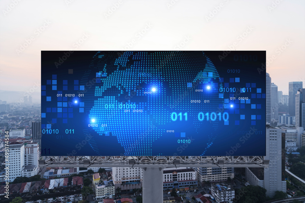 Fototapeta Glowing hologram of Earth planet map on billboard over aerial panoramic cityscape of Kuala Lumpur at sunset, Malaysia, Asia