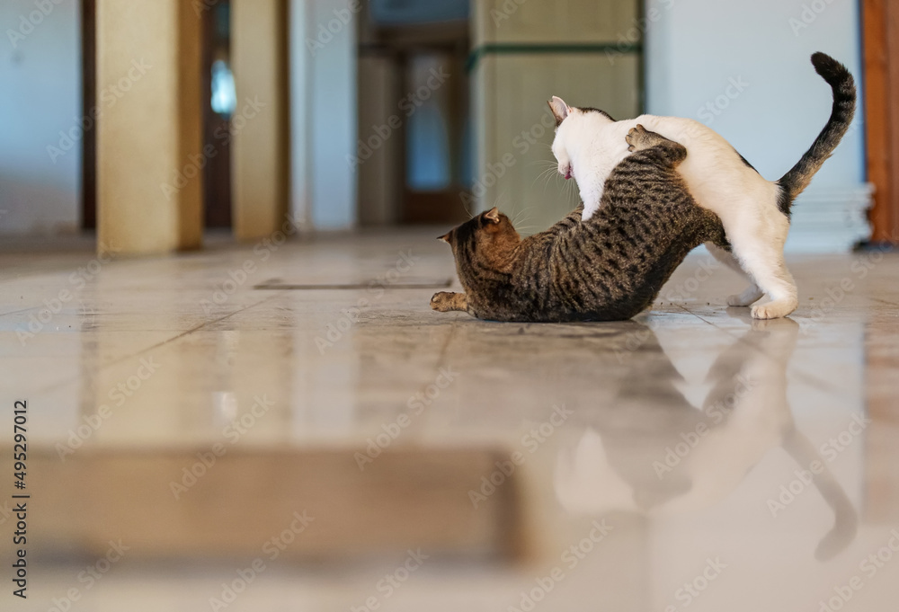 Fototapeta Two stray cats are fighting on the street.