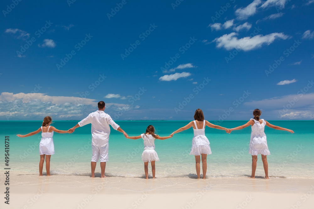 Fototapeta Caucasian parents and daughters in island beach shallows