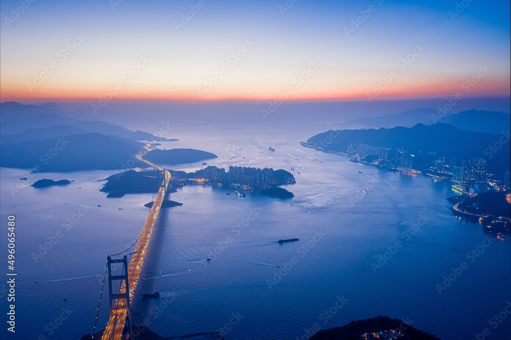 Fototapeta Aerial night view of Tsing Ma Bridge, famous landmark, Hong Kong