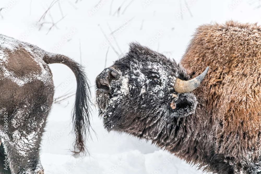 Fototapeta Wild bison seen in natural, outdoor environment during winter time with snowy background