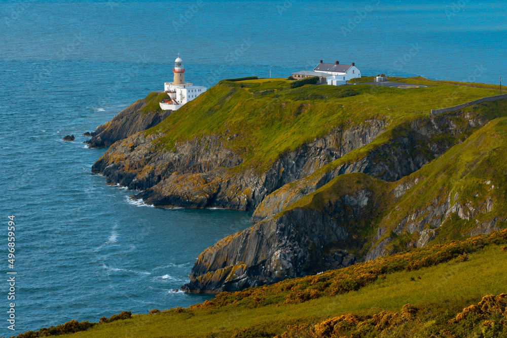 Fototapeta Aerial view a lighthouse on a cliff by the sea Dublin, Republic of Ireland