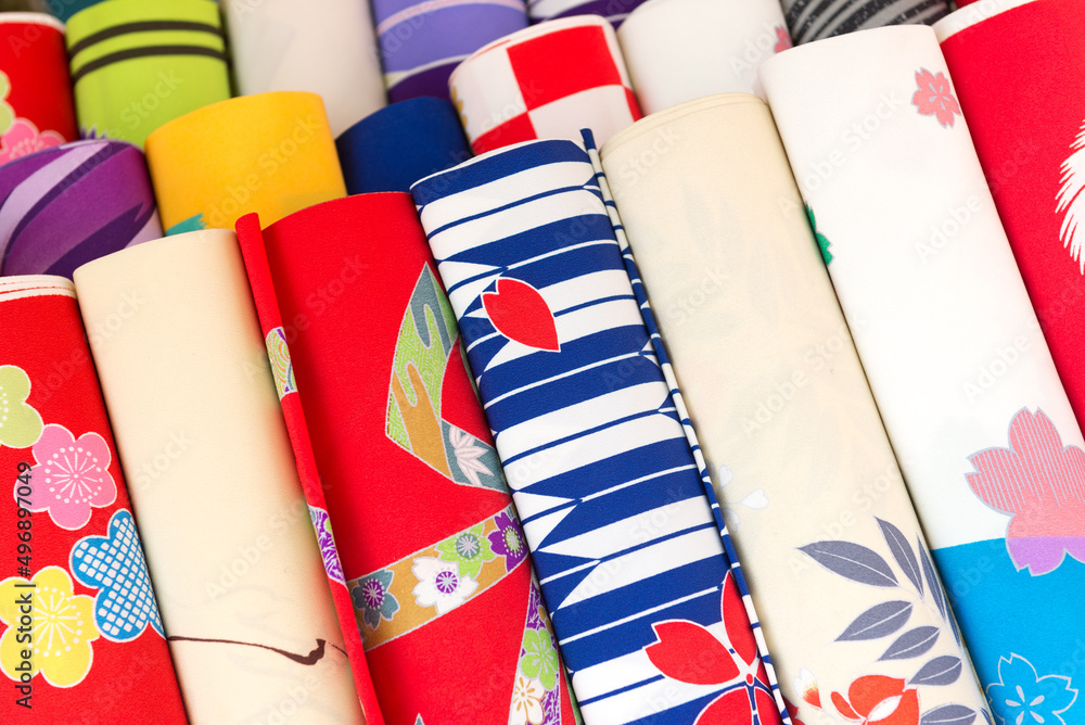 Fototapeta A pile of colorful fabrics at the entrance of a store at Asakusa, Tokyo, Japan