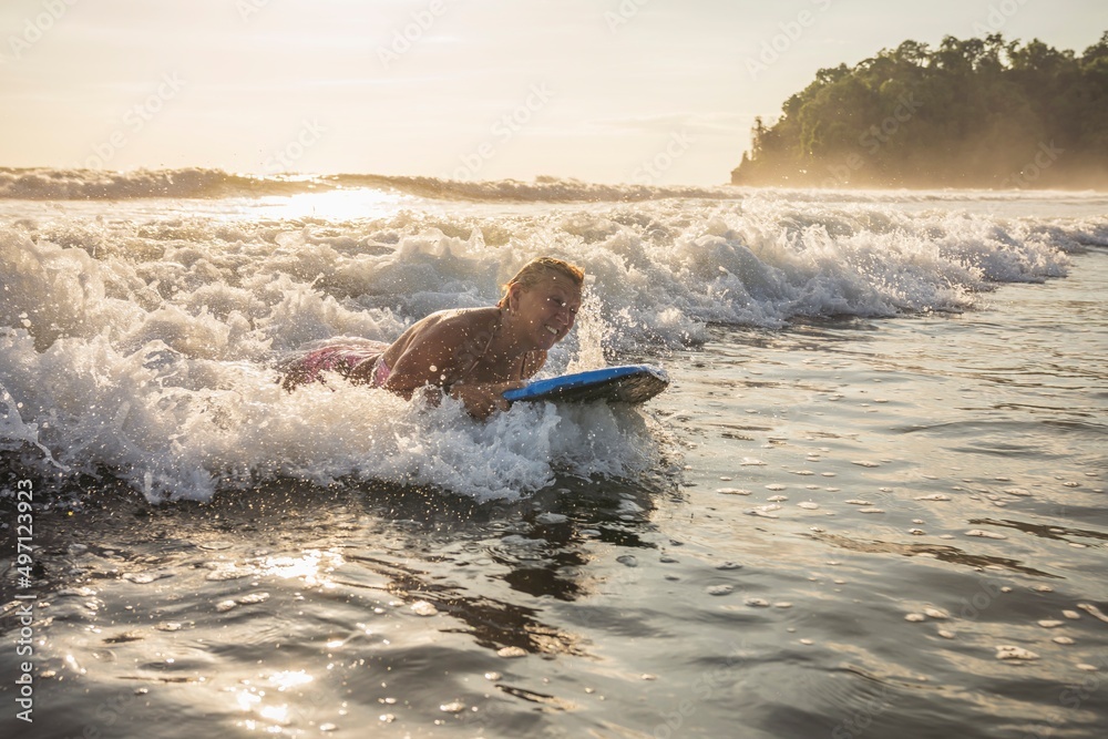Fototapeta woman with Boogie board on the beach at the sunset