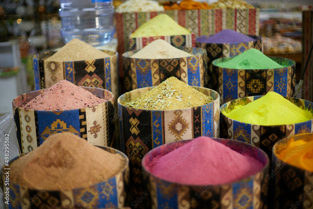 Fototapeta Colorful counter with tea and spices at Turkey market
