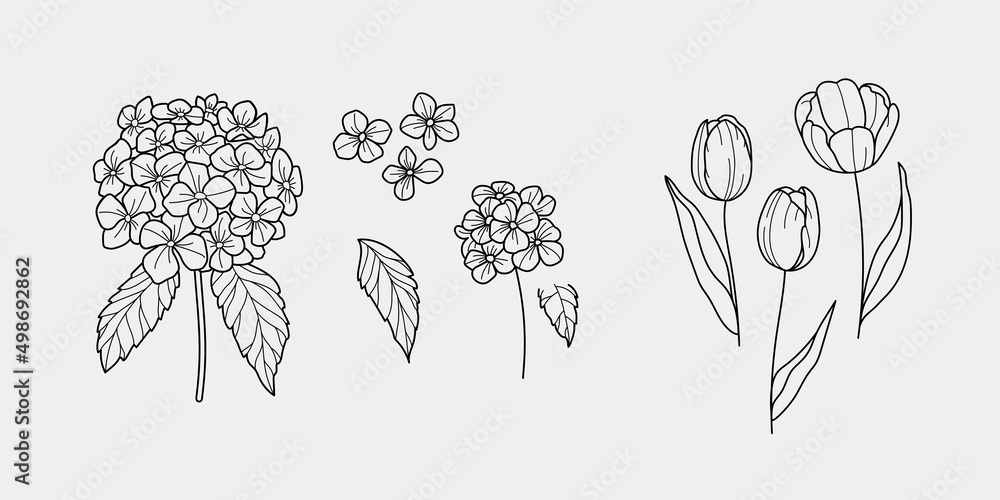 Fototapeta Hand drawn elegant tulips and hydrangea flowers